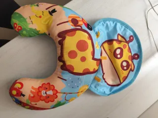 Cojín de actividades para bebés con un divertido diseño de jirafa y otros animales. - Tejido suave y colorido. - Estampado de animales y elementos de la naturaleza. - Forma ergonómica para el apoyo del bebé.