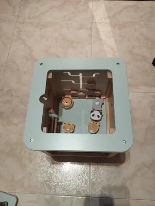 - Estructura de madera. - 30x30x40 - Cuentas de madera para deslizar. - Piezas para encajar. Rodillo, puzles... - Se envía en caja original.