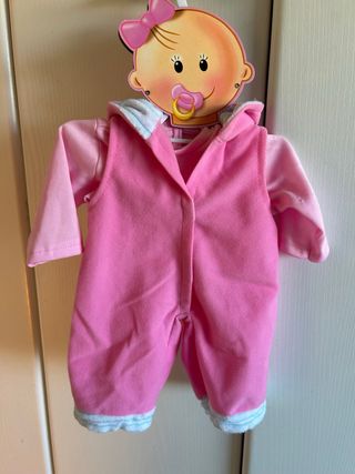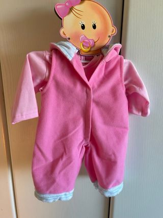 Conjunto de ropa para muñeco bebé. - Color rosa. - Incluye mono con capucha y mangas largas. - Detalle de ribete en puños y tobillos.