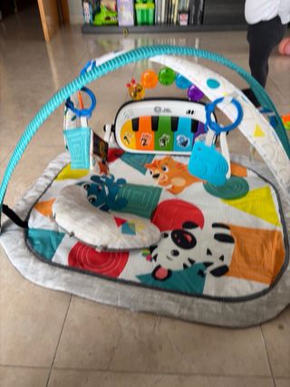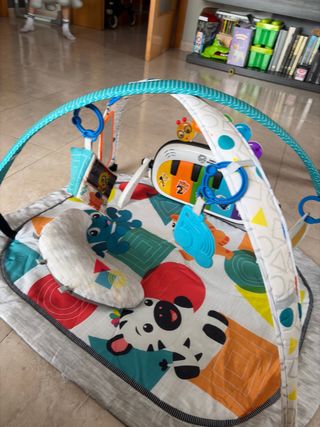 Gimnasio para bebés, ideal para el desarrollo de los más pequeños. - Arco de actividades con juguetes colgantes (faltan 3 monos y 3 anillas) pero se puede substituir por cualquier cosa colgante. - Alfombra acolchadita con diseños infantiles. - Piano musical integrado.