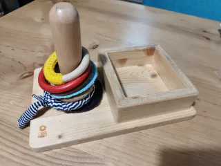 Juego artesanal de encaje de anillas de madera para bebés. Fomenta la motricidad fina y el reconocimiento de colores. - Base de madera con poste y caja. - Anillas de diferentes colores y texturas. - En muy buen estado - Recomendado a partir de 12 meses.