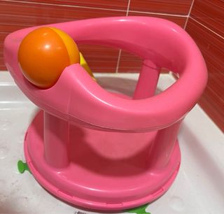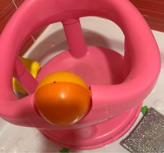 Este soporte está diseñado para ayudar a los bebés durante la hora del baño. - Color rosa. - Incluye un juguete giratorio con bola naranja y amarilla.