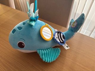 Ballena de peluche interactiva de la marca VTech, diseñada para bebés. Este juguete suave y colorido cuenta con diferentes texturas y elementos para estimular los sentidos. - Peluche de ballena azul. - Incluye espejo. - Adornos de pez y cintas. - Textura acanalada en la aleta.