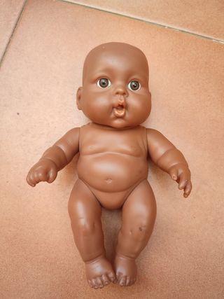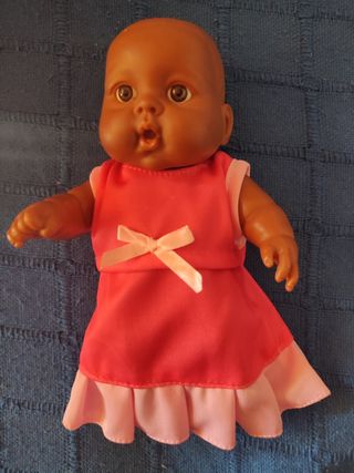 Muñequita bebé de color, blandita, mide 18 cm, brazos y piernas articuladas.