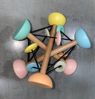 Estimulador sensorial para bebés fabricado en madera con piezas de colores. Aros circulares que se pueden mover por las gomas.