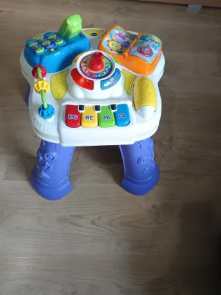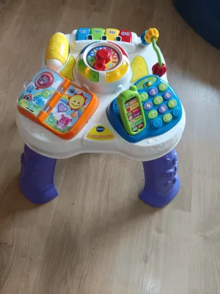Mesa de actividades interactiva de la marca VTech, diseñada para el aprendizaje y la diversión de los más pequeños. - Incluye teléfono, libro y teclado. - Patas moradas con relieve. - Centro de actividades con dial y palanca.