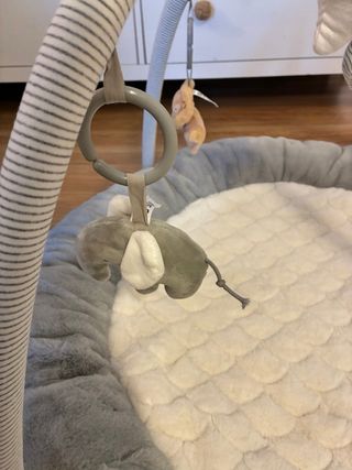 Gimnasio para bebés con arco de actividades y peluches. - En tienda 145€ - Diseño redondo con borde acolchado. - blanco y gris - Centro de actividades con texturas. - Arcos extraibles - Incluye varios peluches colgantes. - 90x90x57 Tiene 2 arcos de juguete extraíbles y 4 peluches colgantes extraíbles, un león, una cebra, un elefante y un mono, que traquetean y chirrían para estimular los sentidos de su bebé. También viene con un suave juguete interactivo de elefante con sonidos y un espejo para que interactúen. El bebé estará súper cómodo gracias a la base acolchada suave.