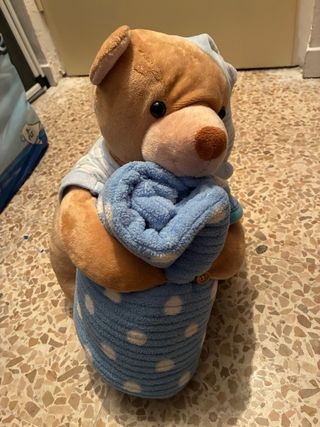 Adorable osito de peluche con una suave manta. - Peluche de color marrón. - Manta de tejido azul con lunares blancos.