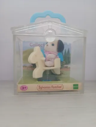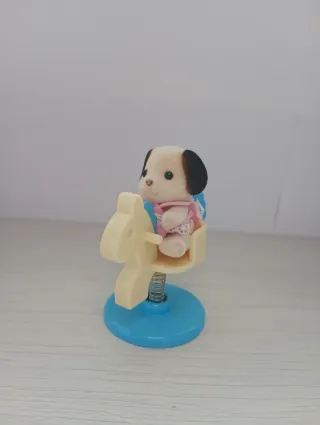 Adorable figura de bebé perrito de Sylvanian Families, listo para jugar en su caballito balancín. - Figura de bebé perrito. - Caballito balancín con muelle.