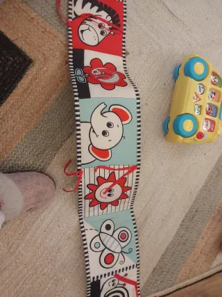 Libro de actividades y protector de cuna con divertidos diseños. - Ilustraciones de animales como cebra, elefante, sol y mariposa. - Colores vivos y contrastados. - Ideal para estimular al bebé.