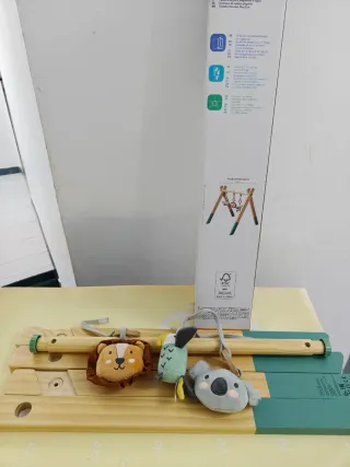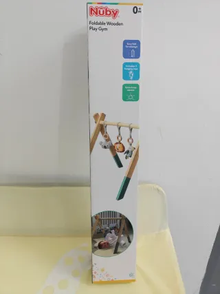 Gimnasio de actividades de madera plegable de la marca Nüby, ideal para bebés a partir de 0 meses. Fomenta el desarrollo sensorial y la motricidad. - Estructura de madera. - Incluye 3 juguetes colgantes. - Fácil de plegar para guardarlo.