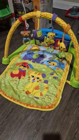 Gimnasio de actividades para bebés con un diseño colorido y entretenido. - Incluye varios juguetes colgantes. - Tapete acolchado para mayor comodidad. - Estructura de arcos para colgar los juguetes.