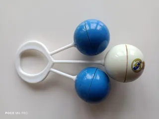 Sonajero para bebé con los colores y escudo del Real Madrid. Ideal para los más pequeños aficionados. - Diseño con dos bolas azules y una blanca. - Mango blanco. - Escudo del Real Madrid en una de las bolas.