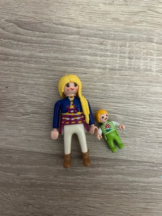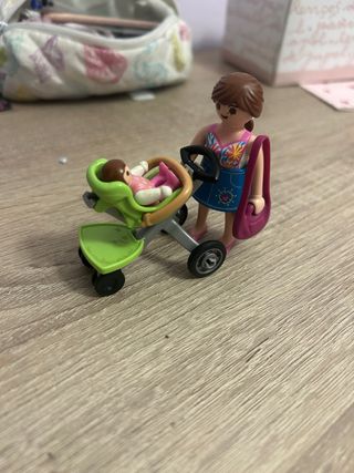 Set de Playmobil que incluye una figura de madre con su bebé en un cochecito.