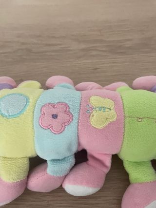 Este adorable peluche con forma de gusano es perfecto para los más pequeños. Sus colores vivos y su sonajero integrado lo hacen muy atractivo. - Diseño de gusano segmentado. - Colores pastel variados: rosa, morado, amarillo, azul y verde. - Pequeño gorro azul en la cabeza. - Patitas suaves. - Sonajero incorporado.