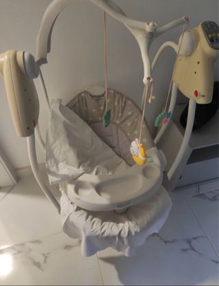 Hamaca eléctrica para bebés. Usada pocas veces. - Incluye dos juguetes colgantes: una estrella y una luna. - Arnés de seguridad de 5 puntos. - Funda extraíble y lavable. - Bluetooth,mando a distancia. - Diferentes niveles de velocidad. - musical. - Con mosquitera