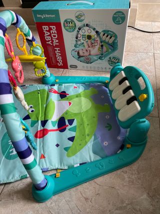 Parque de actividades musical para bebés de la marca Amy & Benton. Incluye piano de patas y arco de juegos. - Piano interactivo con luces. - Arco con juguetes colgantes. - Diseño colorido con temática de dinosaurios.
