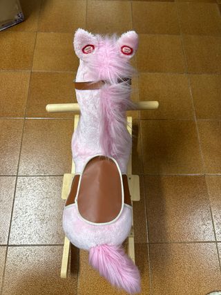 Caballito mecedora de peluche rosa para bebés. Perfecto para los más pequeños. - Peluche suave al tacto. - Riendas y silla de polipiel marrón. - Base de madera para balanceo. Se mueve cola, boca y hace sonido