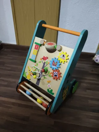 Este andador de madera es un juguete educativo y divertido para los más pequeños. Su diseño colorido y sus múltiples actividades estimulan el desarrollo. - Fabricado en madera. - Incluye ruedas. - Diseños de animales y engranajes.