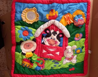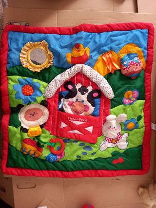 Manta de juegos para bebé con varios juguetes. - Manta acolchada. - Incluye sonajeros y peluches. - Colores vivos y divertidos. Está enrollado en la foto por la conservación.