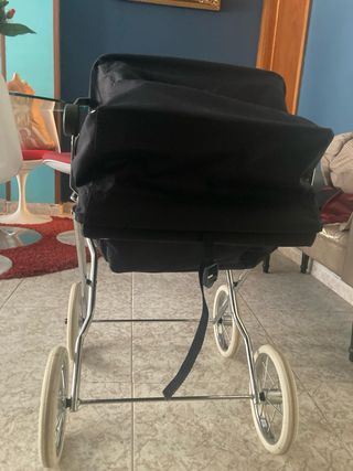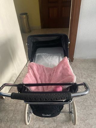 Precioso carrito para muñecas, ideal para niñas. Está en muy buen estado y es perfecto para jugar. - Incluye capazo y bolso a juego. - Diseño elegante con estampado de coronas doradas sobre fondo azul marino. - Tejidos suaves y de calidad.