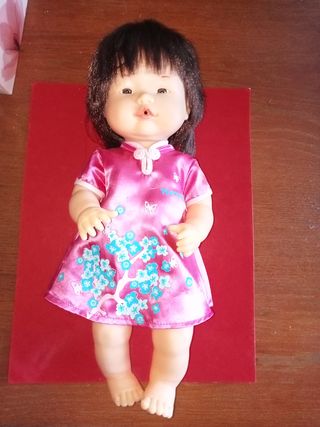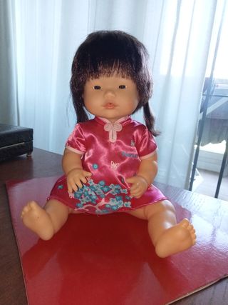 Preciosa muñeca bebé con rasgos asiáticos. Luce un vestido rosa de estilo tradicional con estampado floral. Está en muy buen estado. - Muñeca de vinilo. - Pelo negro y ojos expresivos. - Incluye el vestido que se ve en las fotos.