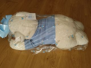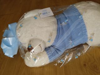 Precioso peluche de oso, ideal para regalar a un recién nacido. Es de color blanco, con un Extrasuave tejido, y viste un jersey azul. Peluche de gran tamaño. - Perfecto estado. - Diseño con estampado de cigüeñas. - 70 x 30cm