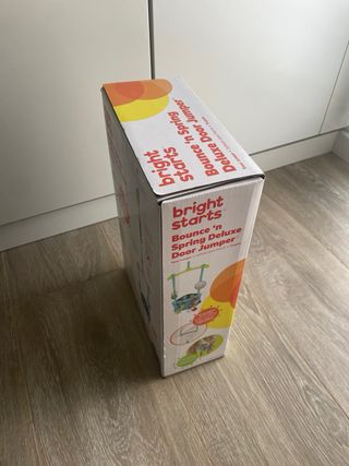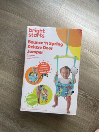 Saltador de puerta marca Bright Starts, modelo Bounce 'n Spring Deluxe Door Jumper. - Diseño colorido y divertido. - Incluye varios juguetes colgantes para el entretenimiento del bebé. - Asiento acolchado para mayor comodidad.