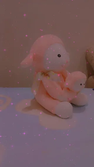 Adorable peluche de oveja en color rosa, con un tierno bebé. - Suave al tacto. - Detalles de lazo en el cuello.