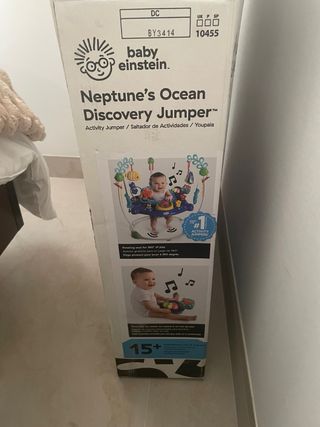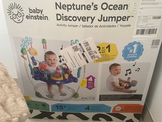 Saltador de actividades Baby Einstein Neptune's Ocean. - Diseñado para bebés de 15+ meses. - Estación de juguetes desmontable para juego sentado o en movimiento. - Altura ajustable en 4 niveles. - Incluye música y sonidos. - Soporta hasta 25 lbs (11 kg). Usado una sola vez.