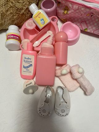 Conjunto de accesorios para bebé en color rosa. - Biberón. - Loción para bebé. - Biberón con dosificador. - Chupete. - Tarro con etiqueta Vitamina C. - Par de patucos blancos.