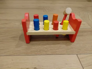 Divertido juego de martillo para los más pequeños. Incluye un martillo de madera y varios postes de colores. - Estructura de madera. - Postes de colores: rojo, azul y amarillo. - Martillo de madera con cabeza de fieltro.