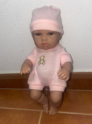 Muñeca baby dolls estilo reborn con un bonito conjunto rosa. 39 cm con cuerpo de tela - Incluye chupete. - Incluye biberón. - Incluye certificado.
