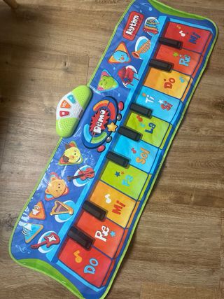 Piano muy grande para poder tocar con tus manos y pies y favorecer la estimulación temprana en bebés y niños pequeños. Con luces, sonidos de instrumentos y animales, 5 ritmos diferentes y 20 canciones de demostración. ¡También puedes grabar tus melodías! Medida 131x48. Se dobla y queda pequeño para recoger.