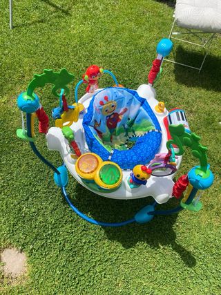 Saltador para bebés de la marca Bright Starts, ideal para el entretenimiento y desarrollo del pequeño. - Diseño colorido y atractivo. - Incluye varios juguetes colgantes para estimular al bebé. - Soporte acolchado para mayor comodidad. - Peso máximo: 26 lb / 11.7 kg.