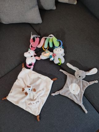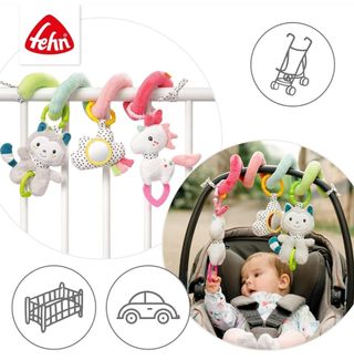 Sonajero espiral de peluche para colgar en la silla de paseo o cuna. - Diseño de oruga con varios animales. - Colores vivos y texturas variadas. - Juguete sensorial con sonajero en la abeja y pito en la rana, también tiene cintas con dibujitos, textura muy suave. Como nuevo. Se puede lavar en la lavadora