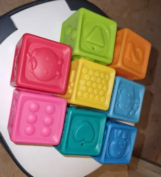Set de cubos sensoriales de diferentes texturas y colores para estimular a los bebés. - Incluye cubos con relieves, números y caras. - Materiales suaves y seguros para los más pequeños. - Diseños variados para el desarrollo táctil y visual.