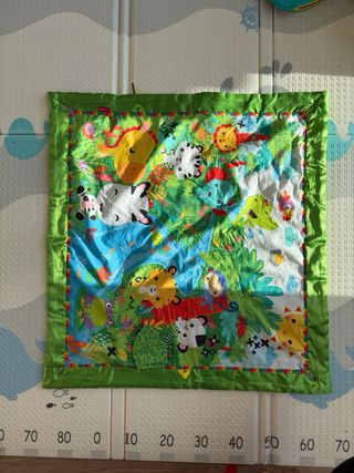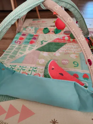 Manta de actividades con un diseño colorido y educativo para bebés. Presenta diferentes texturas y elementos visuales. - Diseño con motivos de animales de granja y frutas. - Incluye elementos colgantes para estimular al bebé. - Materiales suaves y seguros para el contacto con la piel.