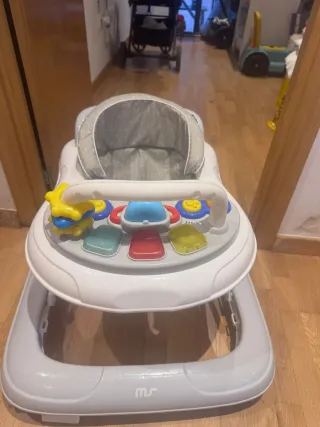 Tacatá para bebés de la marca MS en color gris. Cuenta con una bandeja de juegos interactiva. - Asiento acolchado. - Bandeja con juguetes. - Plegable para fácil almacenamiento. Usado 1 semana.