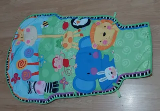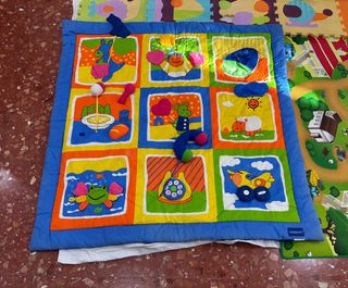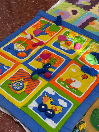 Manta de juegos interactiva y colorida para bebés, diseñada para estimular el desarrollo sensorial. - Diseños de animales y objetos cotidianos. - Texturas variadas para el tacto. - Colores brillantes y contrastantes. - Incluye sonajeros y un espejo. - Muy poco uso. - Medidas: 1 metro x 1 metro. - Marca: Imaginarium.