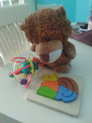 lote de tres juguetes infantiles educativo para bebés: un juego destreza para bebé, puzzle de madera y marioneta peluche, bastante nuevo