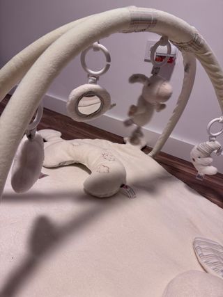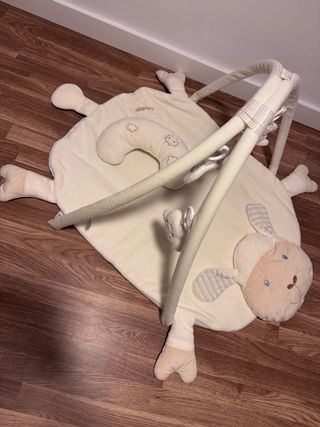 Gimnasio para bebé con arco de juegos y varios juguetes colgantes. - Arco con diseño de arcoíris y rayas. - Incluye sonajeros y mordedores. - Colchoneta con estampado de animales y naturaleza. Solo se ha usado un par de veces está limpio y totalmente nuevo