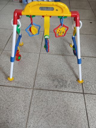 Gimnasio de bebes con alfombra colorida, accesorios mobiles y piano interactivo.
