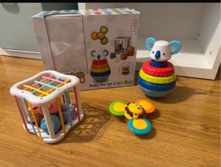 Set de 3 juguetes para bebés, ideal para el desarrollo y entretenimiento. - Pelota apilable con forma de koala. - Aro de encajar con figuras. - Cesta con cuerdas elásticas y figuras. - Incluye un spinner con forma de abeja.