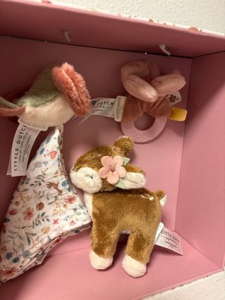 Conjunto de tres piezas de la colección Little Dutch para bebé. Incluye un dudu, un mordedor con forma de flor y un peluche de cervatillo. - Dudu con estampado floral. - Mordedor de silicona rosa con detalles de flor. - Peluche de cervatillo con detalles florales en la cabeza.
