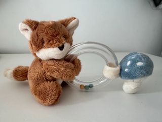 Sonajero con anilla, zorrito y seta de peluche de la colección Amigos del Bosque, de Little Dutch. Este sonajero consta de un simpático y blandito zorrito y una seta unidos a un anillo con bolitas en su interior que emiten un suave sonido al agitarse. Los bebés podrán sujetarlo, agitarlo, morderlo y acariciar las distintas texturas y formas del zorrito y la seta. Es ideal para estimular los sentidos de los más pequeños desde sus etapas más tempranas, mientras desarrollan su coordinación ojo-mano. Edad recomendada: a partir de 0 meses. Está sin estrenar.