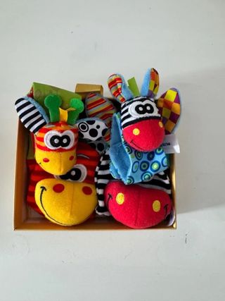 Sonajeros para bebés, aptos desde el nacimiento. Su tejido en colores de alto contraste y patrones de animales los convierte en un juguete ideal para promover el desarrollo visual y la curiosidad de los bebés, así como la coordinación ojo, boca, mano. Incluye: - 2 sonajeros en forma de calcetín para los pies. Son elásticos para que se pongan y se quiten fácilmente. - 2 sonajeros en forma de muñequera para las manos. Se atan de forma sencilla con un velcro que permite ajustarse al tamaño de la muñeca. - Caja original. Están como nuevos. Precio en tienda 14,99€