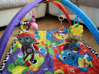 Gimnasio de actividades para bebés con un diseño colorido y divertido. - Incluye arco con varios juguetes colgantes. - Tapete acolchado con ilustraciones de animales. - Elementos de diferentes texturas y colores para estimular al bebé.