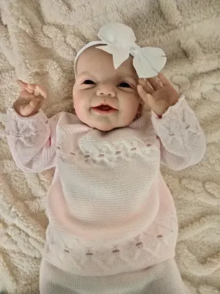 Preciosa muñeca bebé reborn, con detalles muy realistas. - Ropa de punto rosa. - Diadema con lazo blanco - pesa 2 kg aprox y mide 45 cm aprox Incluye la ropa de las fotos,gasa, chupete, body, pijama... Envío rápido