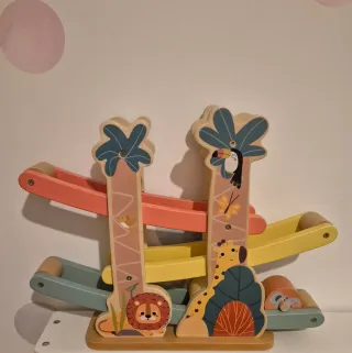 Divertido circuito de madera con temática de animales de la selva para bebés. Ideal para el desarrollo de la motricidad fina. - Diseño con león, jirafa y tucán. - Rampas de colores: rosa, amarillo y verde azulado. - Incluye cochecitos de madera.